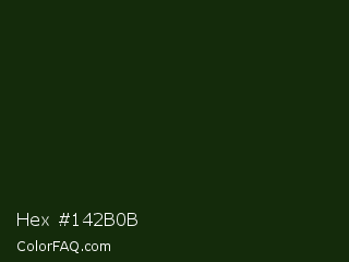 Hex #142b0b Color is a very dark green color and the nearest color is Deep Forest Green #182d09. Hex code #142b0b and RGB value is rgb(20,43,11). In RGB color space, this color is composed of 8% red, 17% green, 4% blue, In CMYK color space, this color is composed of 53% cyan, 0% magenta, 74% yellow , 83% black , In HSL color space, this color has a hue angle of 103° , 59% saturation and 11% lightness.