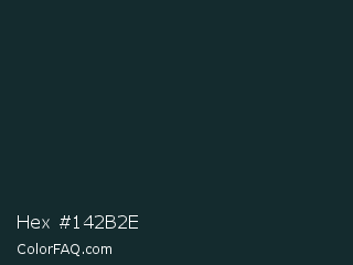 Hex #142b2e Color is a very dark cyan color and the nearest color is Firefly #0e2a30. Hex code #142b2e and RGB value is rgb(20,43,46). In RGB color space, this color is composed of 8% red, 17% green, 18% blue, In CMYK color space, this color is composed of 57% cyan, 7% magenta, 0% yellow , 82% black , In HSL color space, this color has a hue angle of 187° , 39% saturation and 13% lightness.