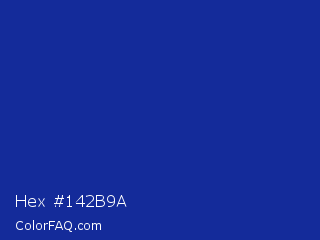 Hex #142b9a Color is a normal blue color and the nearest color is Torea Bay #0f2d9e. Hex code #142b9a and RGB value is rgb(20,43,154). In RGB color space, this color is composed of 8% red, 17% green, 60% blue, In CMYK color space, this color is composed of 87% cyan, 72% magenta, 0% yellow , 40% black , In HSL color space, this color has a hue angle of 230° , 77% saturation and 34% lightness.