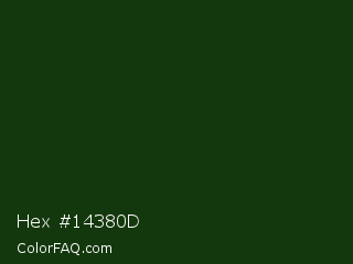 Hex #14380d Color is a very dark green color and the nearest color is Palm Leaf #19330e. Hex code #14380d and RGB value is rgb(20,56,13). In RGB color space, this color is composed of 8% red, 22% green, 5% blue, In CMYK color space, this color is composed of 64% cyan, 0% magenta, 77% yellow , 78% black , In HSL color space, this color has a hue angle of 110° , 62% saturation and 14% lightness.