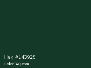 Hex #143928 Color is a very dark green color and the nearest color is Phthalo Green #123524. Hex code #143928 and RGB value is rgb(20,57,40). In RGB color space, this color is composed of 8% red, 22% green, 16% blue, In CMYK color space, this color is composed of 65% cyan, 0% magenta, 30% yellow , 78% black , In HSL color space, this color has a hue angle of 152° , 48% saturation and 15% lightness.