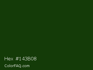 Hex #143b08 Color is a very dark green color and the nearest color is Palm Leaf #19330e. Hex code #143b08 and RGB value is rgb(20,59,8). In RGB color space, this color is composed of 8% red, 23% green, 3% blue, In CMYK color space, this color is composed of 66% cyan, 0% magenta, 86% yellow , 77% black , In HSL color space, this color has a hue angle of 106° , 76% saturation and 13% lightness.