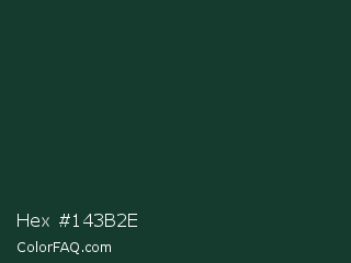 Hex #143b2e Color is a very dark green color and the nearest color is Gable Green #163531. Hex code #143b2e and RGB value is rgb(20,59,46). In RGB color space, this color is composed of 8% red, 23% green, 18% blue, In CMYK color space, this color is composed of 66% cyan, 0% magenta, 22% yellow , 77% black , In HSL color space, this color has a hue angle of 160° , 49% saturation and 15% lightness.
