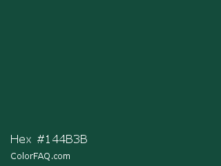 Hex #144b3b Color is a very dark green color and the nearest color is MSU Green #18453b. Hex code #144b3b and RGB value is rgb(20,75,59). In RGB color space, this color is composed of 8% red, 29% green, 23% blue, In CMYK color space, this color is composed of 73% cyan, 0% magenta, 21% yellow , 71% black , In HSL color space, this color has a hue angle of 163° , 58% saturation and 19% lightness.