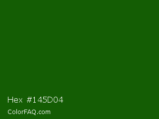 Hex #145d04 Color is a very dark green color and the nearest color is Lincoln Green #195905. Hex code #145d04 and RGB value is rgb(20,93,4). In RGB color space, this color is composed of 8% red, 36% green, 2% blue, In CMYK color space, this color is composed of 78% cyan, 0% magenta, 96% yellow , 64% black , In HSL color space, this color has a hue angle of 109° , 92% saturation and 19% lightness.