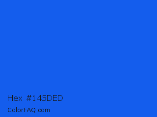 Hex #145ded Color is a normal blue color and the nearest color is Blue Ribbon #0066ff. Hex code #145ded and RGB value is rgb(20,93,237). In RGB color space, this color is composed of 8% red, 36% green, 93% blue, In CMYK color space, this color is composed of 92% cyan, 61% magenta, 0% yellow , 7% black , In HSL color space, this color has a hue angle of 220° , 86% saturation and 50% lightness.