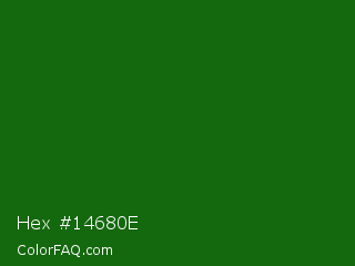 Hex #14680e Color is a dark green color and the nearest color is Japanese Laurel #0a6906. Hex code #14680e and RGB value is rgb(20,104,14). In RGB color space, this color is composed of 8% red, 41% green, 5% blue, In CMYK color space, this color is composed of 81% cyan, 0% magenta, 87% yellow , 59% black , In HSL color space, this color has a hue angle of 116° , 76% saturation and 23% lightness.