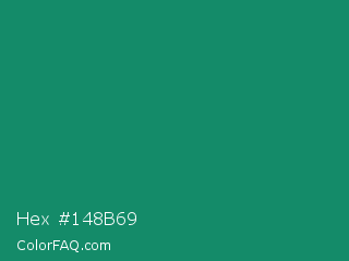 Hex #148b69 Color is a normal green color and the nearest color is Elf Green #088370. Hex code #148b69 and RGB value is rgb(20,139,105). In RGB color space, this color is composed of 8% red, 55% green, 41% blue, In CMYK color space, this color is composed of 86% cyan, 0% magenta, 24% yellow , 45% black , In HSL color space, this color has a hue angle of 163° , 75% saturation and 31% lightness.