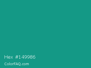 Hex #149986 Color is a normal cyan color and the nearest color is Gossamer #069b81. Hex code #149986 and RGB value is rgb(20,153,134). In RGB color space, this color is composed of 8% red, 60% green, 53% blue, In CMYK color space, this color is composed of 87% cyan, 0% magenta, 12% yellow , 40% black , In HSL color space, this color has a hue angle of 171° , 77% saturation and 34% lightness.