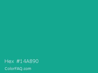Hex #14a890 Color is a normal cyan color and the nearest color is Mountain Meadow Crayola #1ab385. Hex code #14a890 and RGB value is rgb(20,168,144). In RGB color space, this color is composed of 8% red, 66% green, 56% blue, In CMYK color space, this color is composed of 88% cyan, 0% magenta, 14% yellow , 34% black , In HSL color space, this color has a hue angle of 170° , 79% saturation and 37% lightness.
