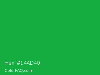 Hex #14ad40 Color is a normal green color and the nearest color is Green Pantone #00ad43. Hex code #14ad40 and RGB value is rgb(20,173,64). In RGB color space, this color is composed of 8% red, 68% green, 25% blue, In CMYK color space, this color is composed of 88% cyan, 0% magenta, 63% yellow , 32% black , In HSL color space, this color has a hue angle of 137° , 79% saturation and 38% lightness.