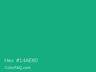 Hex #14ae80 Color is a normal green color and the nearest color is Mountain Meadow Crayola #1ab385. Hex code #14ae80 and RGB value is rgb(20,174,128). In RGB color space, this color is composed of 8% red, 68% green, 50% blue, In CMYK color space, this color is composed of 89% cyan, 0% magenta, 26% yellow , 32% black , In HSL color space, this color has a hue angle of 162° , 79% saturation and 38% lightness.