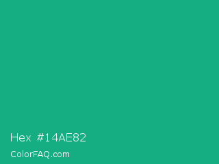 Hex #14ae82 Color is a normal green color and the nearest color is Mountain Meadow Crayola #1ab385. Hex code #14ae82 and RGB value is rgb(20,174,130). In RGB color space, this color is composed of 8% red, 68% green, 51% blue, In CMYK color space, this color is composed of 89% cyan, 0% magenta, 25% yellow , 32% black , In HSL color space, this color has a hue angle of 163° , 79% saturation and 38% lightness.