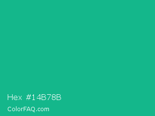 Hex #14b78b Color is a normal cyan color and the nearest color is Mountain Meadow Crayola #1ab385. Hex code #14b78b and RGB value is rgb(20,183,139). In RGB color space, this color is composed of 8% red, 72% green, 55% blue, In CMYK color space, this color is composed of 89% cyan, 0% magenta, 24% yellow , 28% black , In HSL color space, this color has a hue angle of 164° , 80% saturation and 40% lightness.