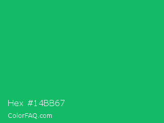Hex #14bb67 Color is a normal green color and the nearest color is Green Crayola #1cac78. Hex code #14bb67 and RGB value is rgb(20,187,103). In RGB color space, this color is composed of 8% red, 73% green, 40% blue, In CMYK color space, this color is composed of 89% cyan, 0% magenta, 45% yellow , 27% black , In HSL color space, this color has a hue angle of 150° , 81% saturation and 41% lightness.