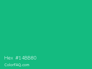 Hex #14bb80 Color is a normal green color and the nearest color is Mountain Meadow Crayola #1ab385. Hex code #14bb80 and RGB value is rgb(20,187,128). In RGB color space, this color is composed of 8% red, 73% green, 50% blue, In CMYK color space, this color is composed of 89% cyan, 0% magenta, 32% yellow , 27% black , In HSL color space, this color has a hue angle of 159° , 81% saturation and 41% lightness.