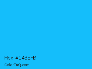 Hex #14befb Color is a normal blue color and the nearest color is Spiro Disco Ball #0fc0fc. Hex code #14befb and RGB value is rgb(20,190,251). In RGB color space, this color is composed of 8% red, 75% green, 98% blue, In CMYK color space, this color is composed of 92% cyan, 24% magenta, 0% yellow , 2% black , In HSL color space, this color has a hue angle of 196° , 97% saturation and 53% lightness.