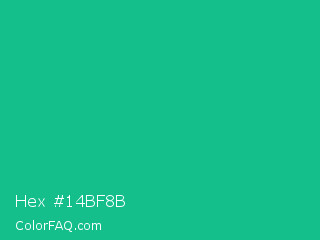 Hex #14bf8b Color is a normal green color and the nearest color is Mountain Meadow Crayola #1ab385. Hex code #14bf8b and RGB value is rgb(20,191,139). In RGB color space, this color is composed of 8% red, 75% green, 55% blue, In CMYK color space, this color is composed of 90% cyan, 0% magenta, 27% yellow , 25% black , In HSL color space, this color has a hue angle of 162° , 81% saturation and 41% lightness.