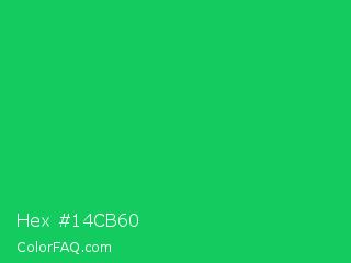 Hex #14cb60 Color is a normal green color and the nearest color is Malachite #0bda51. Hex code #14cb60 and RGB value is rgb(20,203,96). In RGB color space, this color is composed of 8% red, 80% green, 38% blue, In CMYK color space, this color is composed of 90% cyan, 0% magenta, 53% yellow , 20% black , In HSL color space, this color has a hue angle of 145° , 82% saturation and 44% lightness.