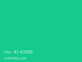 Hex #14cb8b Color is a normal green color and the nearest color is Caribbean Green #00cc99. Hex code #14cb8b and RGB value is rgb(20,203,139). In RGB color space, this color is composed of 8% red, 80% green, 55% blue, In CMYK color space, this color is composed of 90% cyan, 0% magenta, 32% yellow , 20% black , In HSL color space, this color has a hue angle of 159° , 82% saturation and 44% lightness.