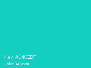 Hex #14cebf Color is a normal cyan color and the nearest color is Java #1fc2c2. Hex code #14cebf and RGB value is rgb(20,206,191). In RGB color space, this color is composed of 8% red, 81% green, 75% blue, In CMYK color space, this color is composed of 90% cyan, 0% magenta, 7% yellow , 19% black , In HSL color space, this color has a hue angle of 175° , 82% saturation and 44% lightness.