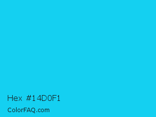 Hex #14d0f1 Color is a normal cyan color and the nearest color is Spiro Disco Ball #0fc0fc. Hex code #14d0f1 and RGB value is rgb(20,208,241). In RGB color space, this color is composed of 8% red, 82% green, 95% blue, In CMYK color space, this color is composed of 92% cyan, 14% magenta, 0% yellow , 5% black , In HSL color space, this color has a hue angle of 189° , 89% saturation and 51% lightness.