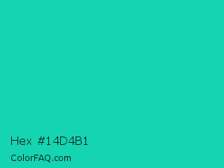 Hex #14d4b1 Color is a normal cyan color and the nearest color is Amazonite #00c4b0. Hex code #14d4b1 and RGB value is rgb(20,212,177). In RGB color space, this color is composed of 8% red, 83% green, 69% blue, In CMYK color space, this color is composed of 91% cyan, 0% magenta, 17% yellow , 17% black , In HSL color space, this color has a hue angle of 169° , 83% saturation and 45% lightness.