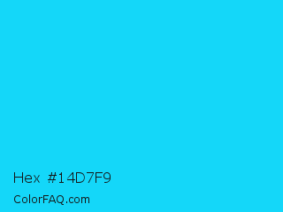 Hex #14d7f9 Color is a normal cyan color and the nearest color is Vivid Sky Blue #00ccff. Hex code #14d7f9 and RGB value is rgb(20,215,249). In RGB color space, this color is composed of 8% red, 84% green, 98% blue, In CMYK color space, this color is composed of 92% cyan, 14% magenta, 0% yellow , 2% black , In HSL color space, this color has a hue angle of 189° , 95% saturation and 53% lightness.