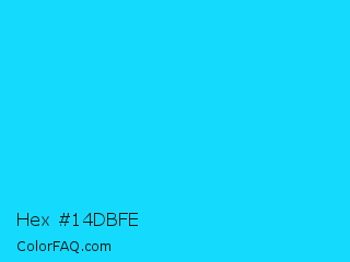 Hex #14dbfe Color is a normal cyan color and the nearest color is Loeen #15f2fd. Hex code #14dbfe and RGB value is rgb(20,219,254). In RGB color space, this color is composed of 8% red, 86% green, 100% blue, In CMYK color space, this color is composed of 92% cyan, 14% magenta, 0% yellow , 0% black , In HSL color space, this color has a hue angle of 189° , 99% saturation and 54% lightness.
