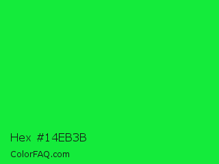 Hex #14eb3b Color is a normal green color and the nearest color is Malachite #0bda51. Hex code #14eb3b and RGB value is rgb(20,235,59). In RGB color space, this color is composed of 8% red, 92% green, 23% blue, In CMYK color space, this color is composed of 91% cyan, 0% magenta, 75% yellow , 8% black , In HSL color space, this color has a hue angle of 131° , 84% saturation and 50% lightness.