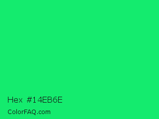 Hex #14eb6e Color is a normal green color and the nearest color is Spring Green #00ff7f. Hex code #14eb6e and RGB value is rgb(20,235,110). In RGB color space, this color is composed of 8% red, 92% green, 43% blue, In CMYK color space, this color is composed of 91% cyan, 0% magenta, 53% yellow , 8% black , In HSL color space, this color has a hue angle of 145° , 84% saturation and 50% lightness.