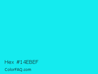 Hex #14ebef Color is a normal cyan color and the nearest color is Loeen #15f2fd. Hex code #14ebef and RGB value is rgb(20,235,239). In RGB color space, this color is composed of 8% red, 92% green, 94% blue, In CMYK color space, this color is composed of 92% cyan, 2% magenta, 0% yellow , 6% black , In HSL color space, this color has a hue angle of 181° , 87% saturation and 51% lightness.
