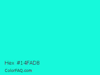 Hex #14fad8 Color is a normal cyan color and the nearest color is Bright Turquoise #08e8de. Hex code #14fad8 and RGB value is rgb(20,250,216). In RGB color space, this color is composed of 8% red, 98% green, 85% blue, In CMYK color space, this color is composed of 92% cyan, 0% magenta, 14% yellow , 2% black , In HSL color space, this color has a hue angle of 171° , 96% saturation and 53% lightness.