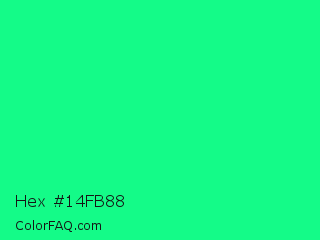 Hex #14fb88 Color is a normal green color and the nearest color is Spring Green #00ff7f. Hex code #14fb88 and RGB value is rgb(20,251,136). In RGB color space, this color is composed of 8% red, 98% green, 53% blue, In CMYK color space, this color is composed of 92% cyan, 0% magenta, 46% yellow , 2% black , In HSL color space, this color has a hue angle of 150° , 97% saturation and 53% lightness.
