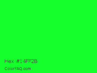 Hex #14ff2b Color is a normal green color and the nearest color is Neon Green #39ff14. Hex code #14ff2b and RGB value is rgb(20,255,43). In RGB color space, this color is composed of 8% red, 100% green, 17% blue, In CMYK color space, this color is composed of 92% cyan, 0% magenta, 83% yellow , 0% black , In HSL color space, this color has a hue angle of 126° , 100% saturation and 54% lightness.