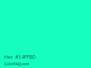 Hex #14ffbd Color is a normal green color and the nearest color is Medium Spring Green #00fa9a. Hex code #14ffbd and RGB value is rgb(20,255,189). In RGB color space, this color is composed of 8% red, 100% green, 74% blue, In CMYK color space, this color is composed of 92% cyan, 0% magenta, 26% yellow , 0% black , In HSL color space, this color has a hue angle of 163° , 100% saturation and 54% lightness.