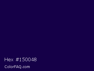 Hex #150048 Color is a very dark indigo color and the nearest color is Tolopea #1b0245. Hex code #150048 and RGB value is rgb(21,0,72). In RGB color space, this color is composed of 8% red, 0% green, 28% blue, In CMYK color space, this color is composed of 71% cyan, 100% magenta, 0% yellow , 72% black , In HSL color space, this color has a hue angle of 258° , 100% saturation and 14% lightness.
