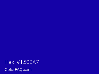 Hex #1502a7 Color is a normal indigo color and the nearest color is Duke Blue #00009c. Hex code #1502a7 and RGB value is rgb(21,2,167). In RGB color space, this color is composed of 8% red, 1% green, 65% blue, In CMYK color space, this color is composed of 87% cyan, 99% magenta, 0% yellow , 35% black , In HSL color space, this color has a hue angle of 247° , 98% saturation and 33% lightness.