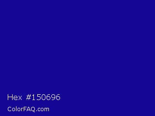 Hex #150696 Color is a normal indigo color and the nearest color is Ultramarine #120a8f. Hex code #150696 and RGB value is rgb(21,6,150). In RGB color space, this color is composed of 8% red, 2% green, 59% blue, In CMYK color space, this color is composed of 86% cyan, 96% magenta, 0% yellow , 41% black , In HSL color space, this color has a hue angle of 246° , 92% saturation and 31% lightness.