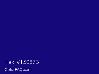 Hex #15087b Color is a dark indigo color and the nearest color is Deep Koamaru #1b127b. Hex code #15087b and RGB value is rgb(21,8,123). In RGB color space, this color is composed of 8% red, 3% green, 48% blue, In CMYK color space, this color is composed of 83% cyan, 93% magenta, 0% yellow , 52% black , In HSL color space, this color has a hue angle of 247° , 88% saturation and 26% lightness.
