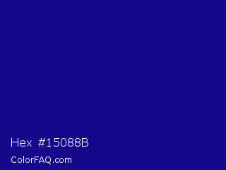Hex #15088b Color is a dark indigo color and the nearest color is Ultramarine #120a8f. Hex code #15088b and RGB value is rgb(21,8,139). In RGB color space, this color is composed of 8% red, 3% green, 55% blue, In CMYK color space, this color is composed of 85% cyan, 94% magenta, 0% yellow , 45% black , In HSL color space, this color has a hue angle of 246° , 89% saturation and 29% lightness.
