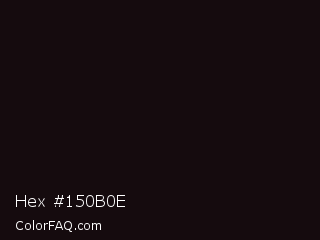 Hex #150b0e Color is a almost black rose color and the nearest color is Smoky Black #100c08. Hex code #150b0e and RGB value is rgb(21,11,14). In RGB color space, this color is composed of 8% red, 4% green, 5% blue, In CMYK color space, this color is composed of 0% cyan, 48% magenta, 33% yellow , 92% black , In HSL color space, this color has a hue angle of 342° , 31% saturation and 6% lightness.