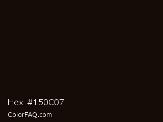 Hex #150c07 Color is a almost black orange color and the nearest color is Asphalt #130a06. Hex code #150c07 and RGB value is rgb(21,12,7). In RGB color space, this color is composed of 8% red, 5% green, 3% blue, In CMYK color space, this color is composed of 0% cyan, 43% magenta, 67% yellow , 92% black , In HSL color space, this color has a hue angle of 21° , 50% saturation and 5% lightness.