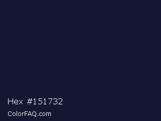Hex #151732 Color is a very dark blue color and the nearest color is Haiti #1b1035. Hex code #151732 and RGB value is rgb(21,23,50). In RGB color space, this color is composed of 8% red, 9% green, 20% blue, In CMYK color space, this color is composed of 58% cyan, 54% magenta, 0% yellow , 80% black , In HSL color space, this color has a hue angle of 236° , 41% saturation and 14% lightness.