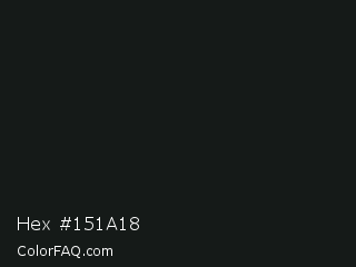 Hex #151a18 Color is a almost black green color and the nearest color is Eerie Black #1b1b1b. Hex code #151a18 and RGB value is rgb(21,26,24). In RGB color space, this color is composed of 8% red, 10% green, 9% blue, In CMYK color space, this color is composed of 19% cyan, 0% magenta, 8% yellow , 90% black , In HSL color space, this color has a hue angle of 156° , 11% saturation and 9% lightness.