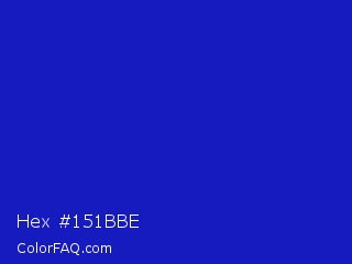 Hex #151bbe Color is a normal blue color and the nearest color is Blue Pantone #0018a8. Hex code #151bbe and RGB value is rgb(21,27,190). In RGB color space, this color is composed of 8% red, 11% green, 75% blue, In CMYK color space, this color is composed of 89% cyan, 86% magenta, 0% yellow , 25% black , In HSL color space, this color has a hue angle of 238° , 80% saturation and 41% lightness.