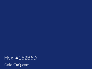 Hex #152b6d Color is a dark blue color and the nearest color is Biscay #1b3162. Hex code #152b6d and RGB value is rgb(21,43,109). In RGB color space, this color is composed of 8% red, 17% green, 43% blue, In CMYK color space, this color is composed of 81% cyan, 61% magenta, 0% yellow , 57% black , In HSL color space, this color has a hue angle of 225° , 68% saturation and 25% lightness.