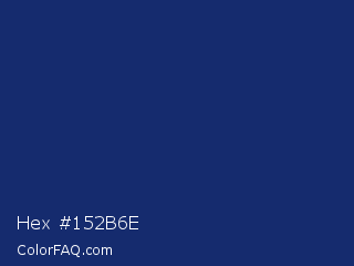 Hex #152b6e Color is a dark blue color and the nearest color is Biscay #1b3162. Hex code #152b6e and RGB value is rgb(21,43,110). In RGB color space, this color is composed of 8% red, 17% green, 43% blue, In CMYK color space, this color is composed of 81% cyan, 61% magenta, 0% yellow , 57% black , In HSL color space, this color has a hue angle of 225° , 68% saturation and 26% lightness.