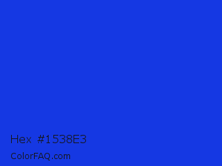Hex #1538e3 Color is a normal blue color and the nearest color is Palatinate Blue #273be2. Hex code #1538e3 and RGB value is rgb(21,56,227). In RGB color space, this color is composed of 8% red, 22% green, 89% blue, In CMYK color space, this color is composed of 91% cyan, 75% magenta, 0% yellow , 11% black , In HSL color space, this color has a hue angle of 230° , 83% saturation and 49% lightness.