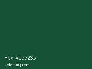 Hex #155235 Color is a very dark green color and the nearest color is Brunswick Green #1b4d3e. Hex code #155235 and RGB value is rgb(21,82,53). In RGB color space, this color is composed of 8% red, 32% green, 21% blue, In CMYK color space, this color is composed of 74% cyan, 0% magenta, 35% yellow , 68% black , In HSL color space, this color has a hue angle of 151° , 59% saturation and 20% lightness.